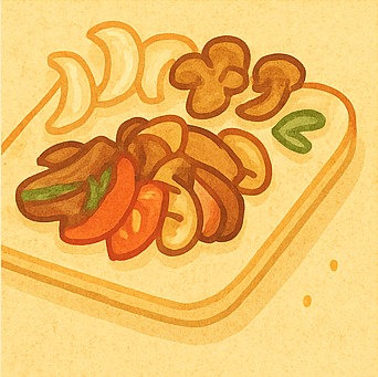 - 가니시: 느타리버섯, 방울토마토, 양파, 마늘 등