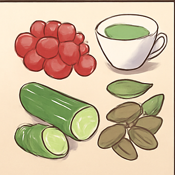 - 오이 & 녹차: 수분 공급 및 항염 작용.
