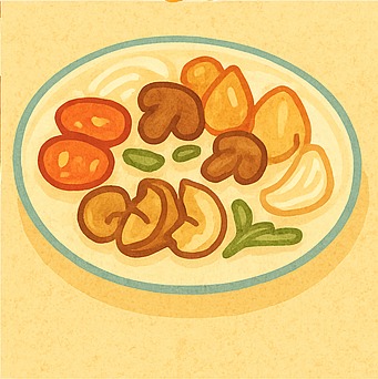 - 가니시: 느타리버섯, 방울토마토, 양파, 마늘 등